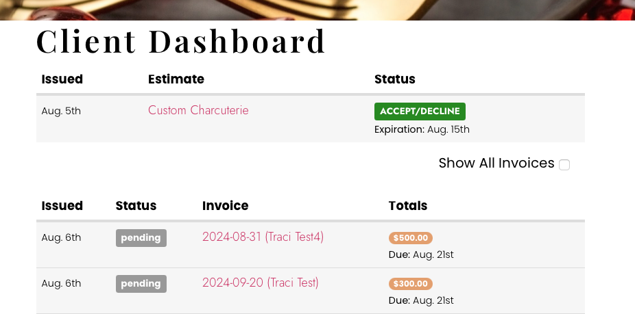 The Client Dashboard is a way for your clients to view pending estimates, view invoice and payment history, and easily see what payments are pending and when they’re due.